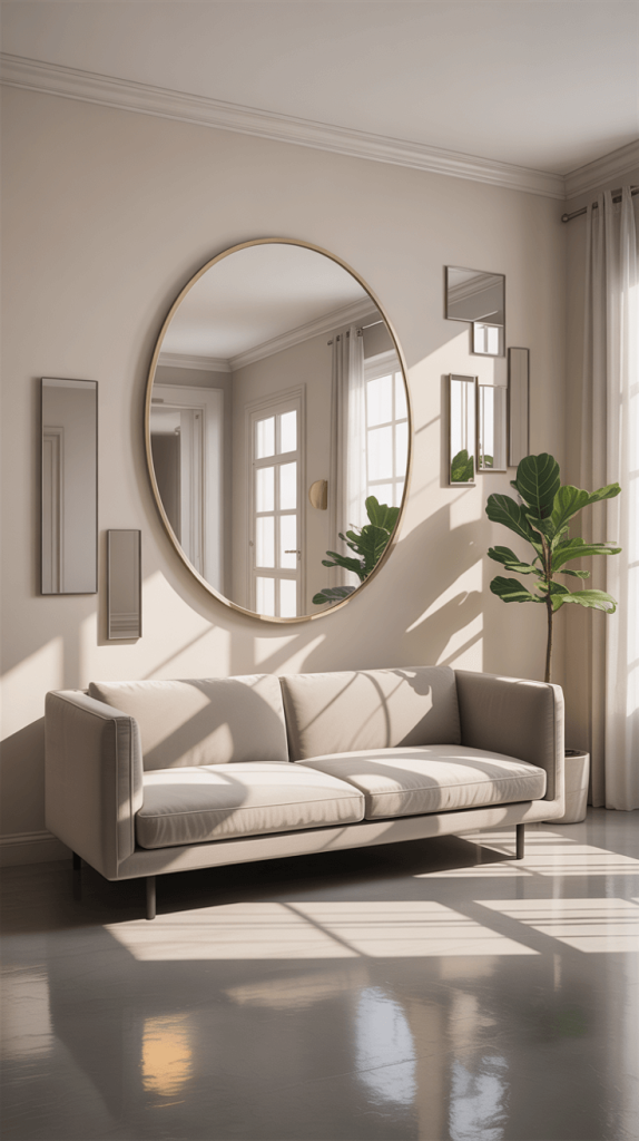 • Creative Shapes: Don’t feel confined to a basic rectangle. A round sunburst mirror, a series of arched mirrors, or an asymmetrical design can also serve as incredible art pieces.