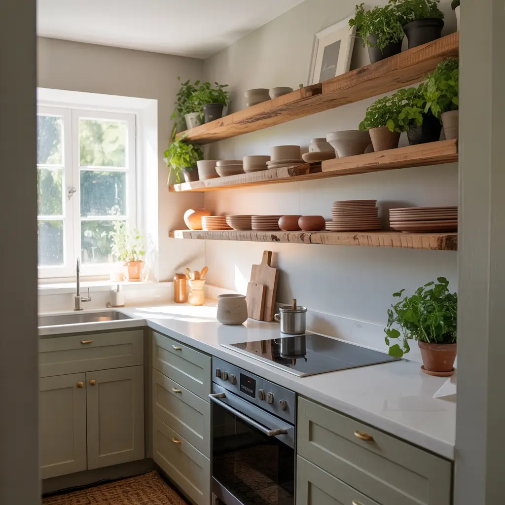 Can’t afford fancy corner solutions? Here’s my hack: open corner shelving. It forces you to keep things tidy (because everyone can see it) while making that corner space actually useful. Plus, it creates interesting visual angles that make your kitchen feel larger.