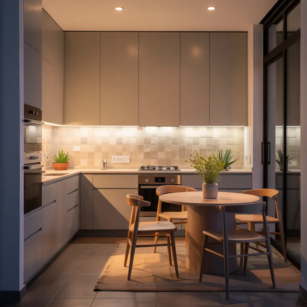 Picture this: sleek handleless cabinets reaching up to the ceiling (hello, vertical storage!), a compact induction cooktop, and a pull-out dining table that disappears when you’re done eating. The dining corner doesn’t need to be huge – just cozy enough for intimate meals.