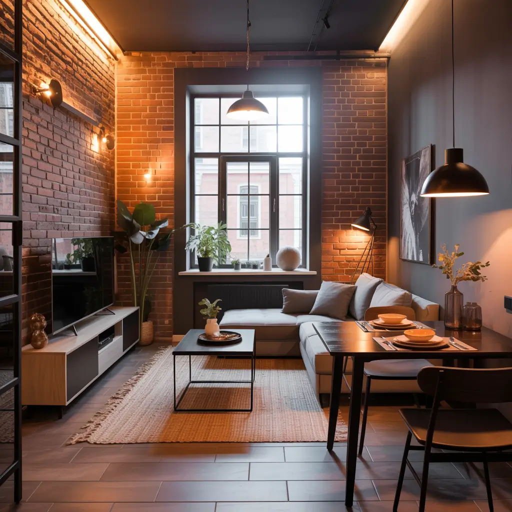 Exposed brick walls (real or faux), metal fixtures, and concrete elements create visual interest without cluttering the space. I added a steel-framed room divider between my kitchen and living area – it defines the zones without blocking light or making the space feel smaller.
