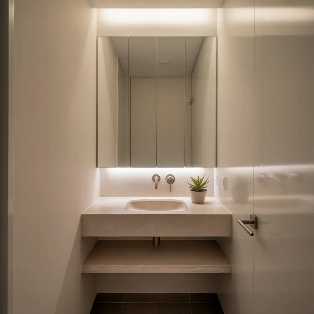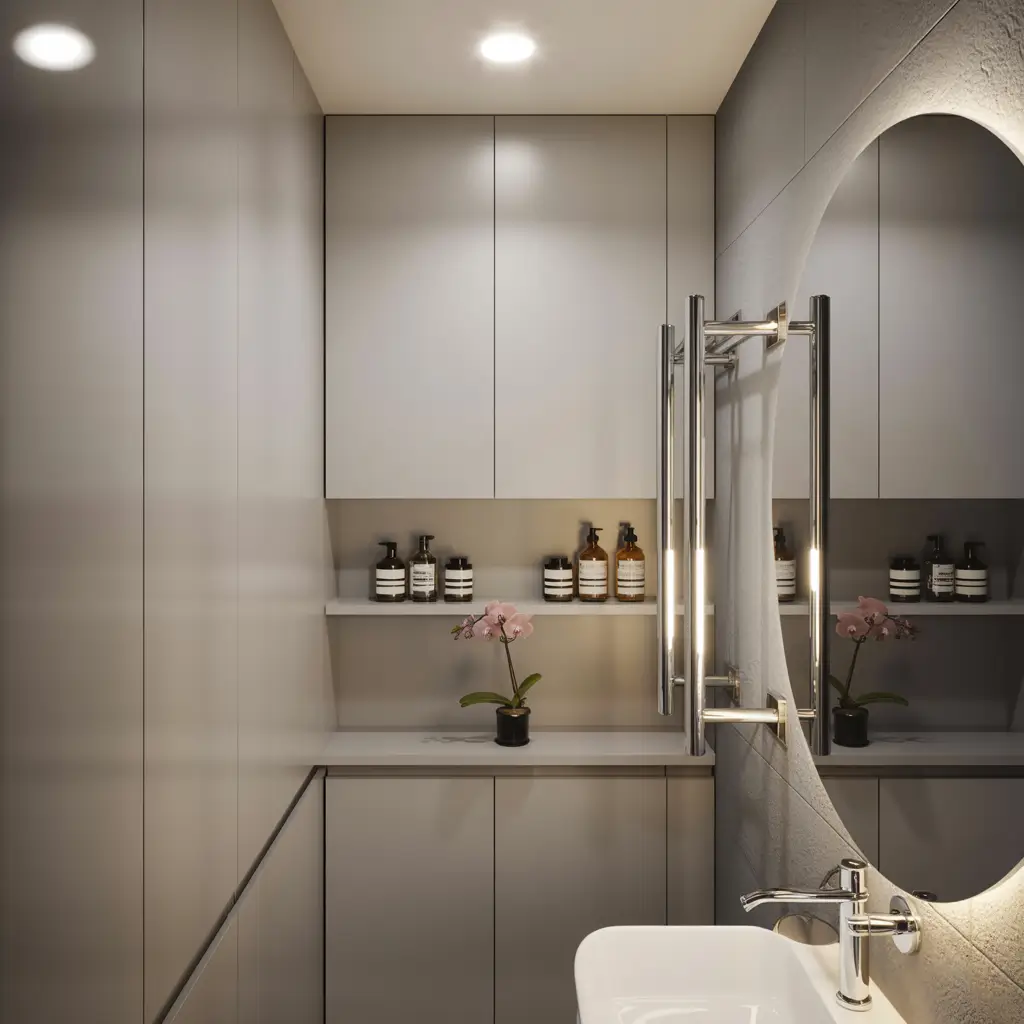 Layer your lighting with overhead fixtures, vanity lights, and accent lighting. LED strips under floating vanities create a hovering effect that’s both practical and stylish. Backlit mirrors provide even facial lighting without taking up any extra space.
