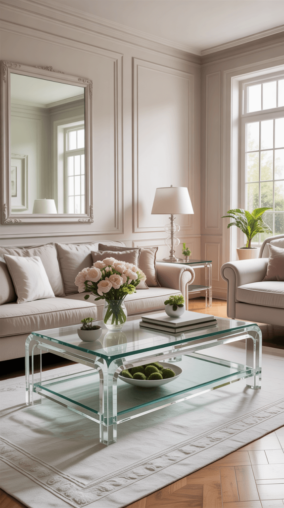 - Glass Coffee Tables: They provide a solid surface but don’t visually break up the room. You can still see the rug and floor underneath, maintaining a sense of flow and openness.