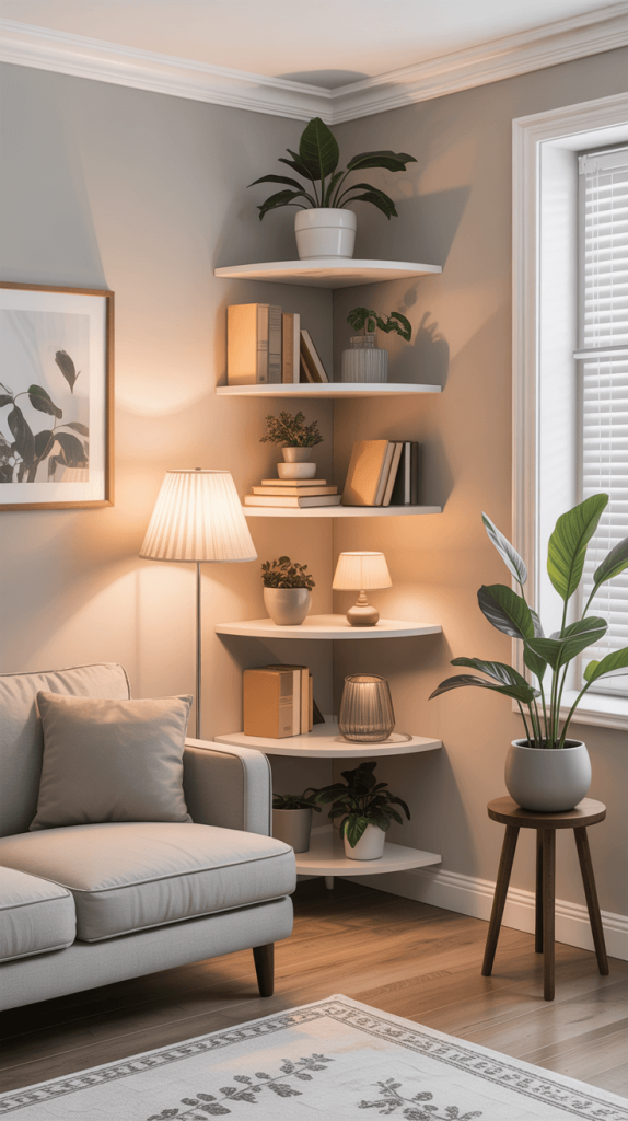 - Floating Corner Shelves: A trio of staggered floating shelves can turn a blank corner into a beautiful display nook for plants, photos, or books.