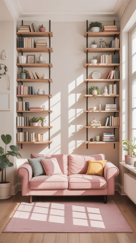 - Wall-mounted shelving: Floating shelves keep the floor completely clear, maintaining that airy feel. Use them for everything from your book collection to small potted plants.