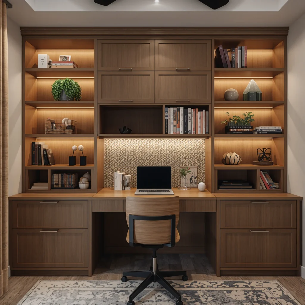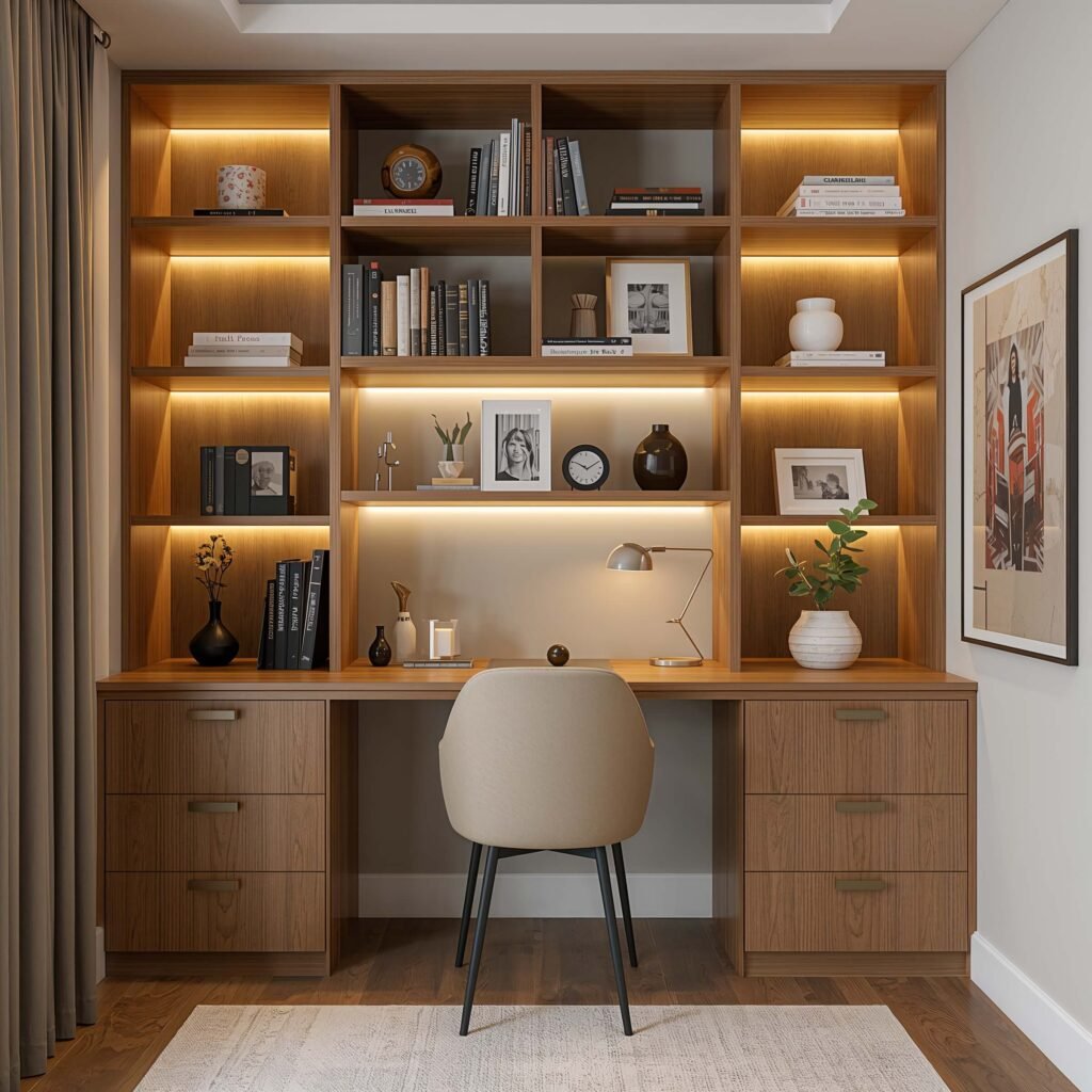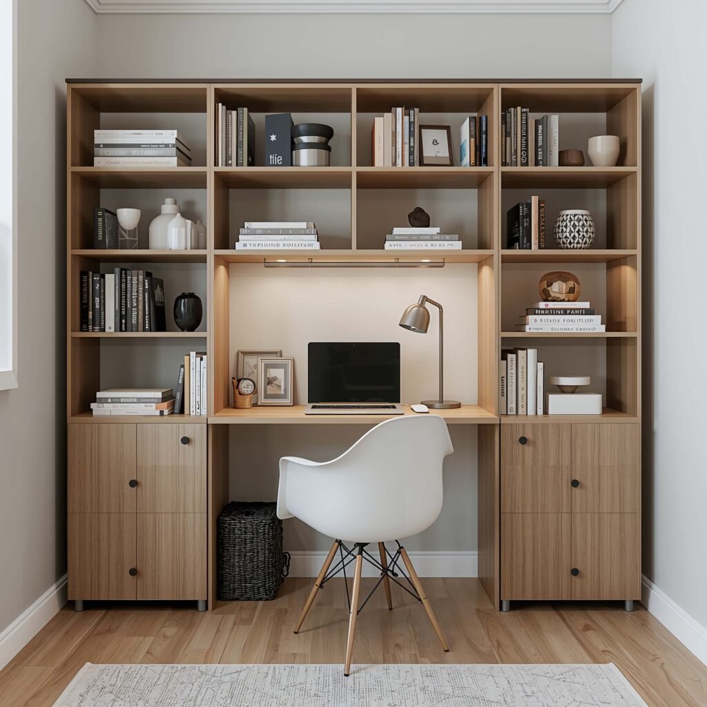 Picture this: floor-to-ceiling shelving with a desk surface built right in. Books above, workspace in the middle, storage below. It’s organized, it’s efficient, and it makes you look like you actually read all those books you bought (we both know you haven’t).