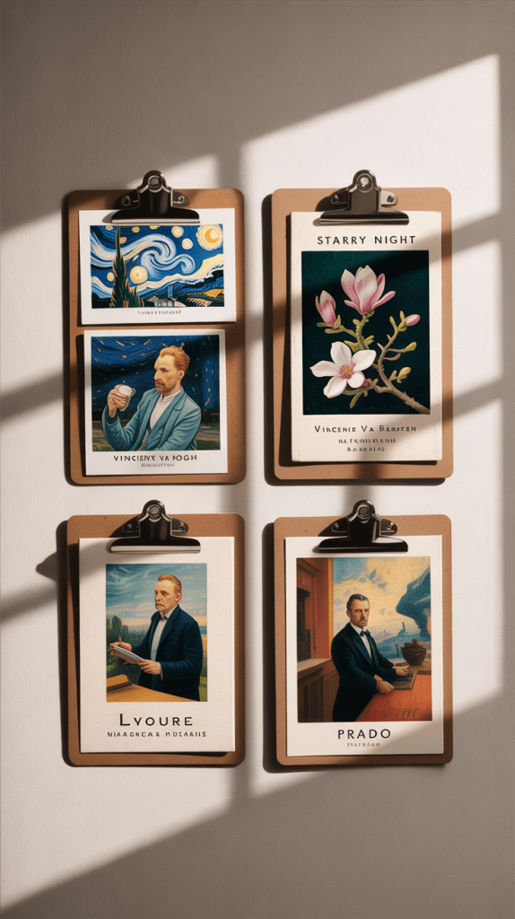 Postcards are cheap, easy to find, and easy to swap out. A cluster of them creates a big impact for very little money. It’s a fantastic way to display art you love from museums you’ve visited or artists you admire.