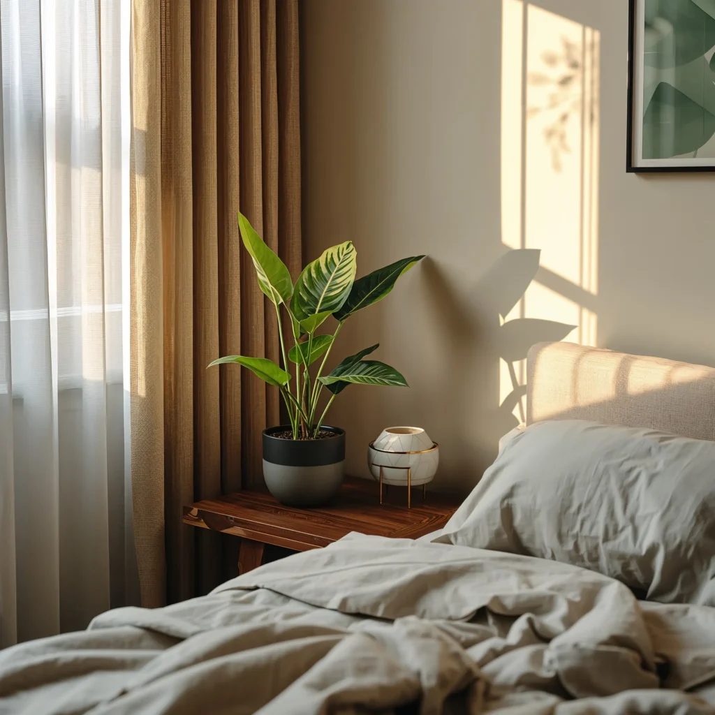 Create a calming corner by placing a snake plant near your window, paired with soft, neutral bedding and maybe a cozy reading chair. The plant’s clean lines and gentle green color promote that zen feeling we’re all chasing after long days.