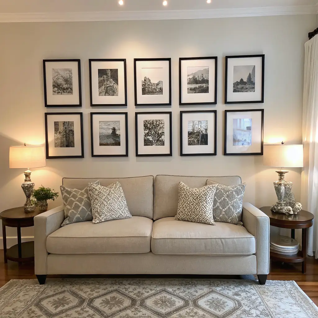 The spacing matters more than you think. Keep 2-3 inches between frames for a cohesive look. If you go too wide, the collection looks scattered. Too close, and it feels cramped. It’s all about finding that sweet spot where each piece has room to breathe.
