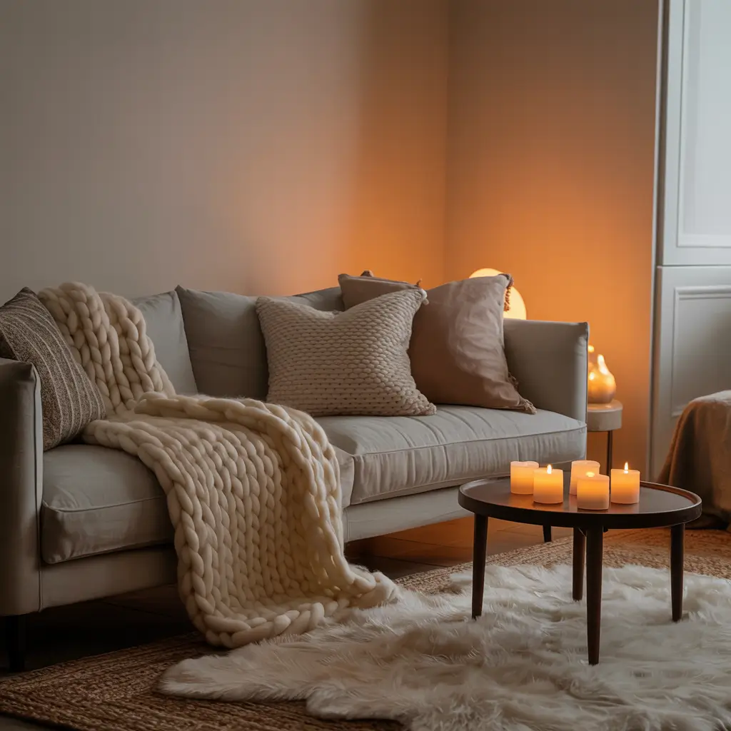 Warm lighting makes all the difference in creating that cozy atmosphere. Position table lamps or floor lamps near your sofa to create pools of soft, warm light. Overhead lighting is the enemy of coziness – it’s harsh and uninviting. Think more “romantic restaurant” and less “dentist office.”