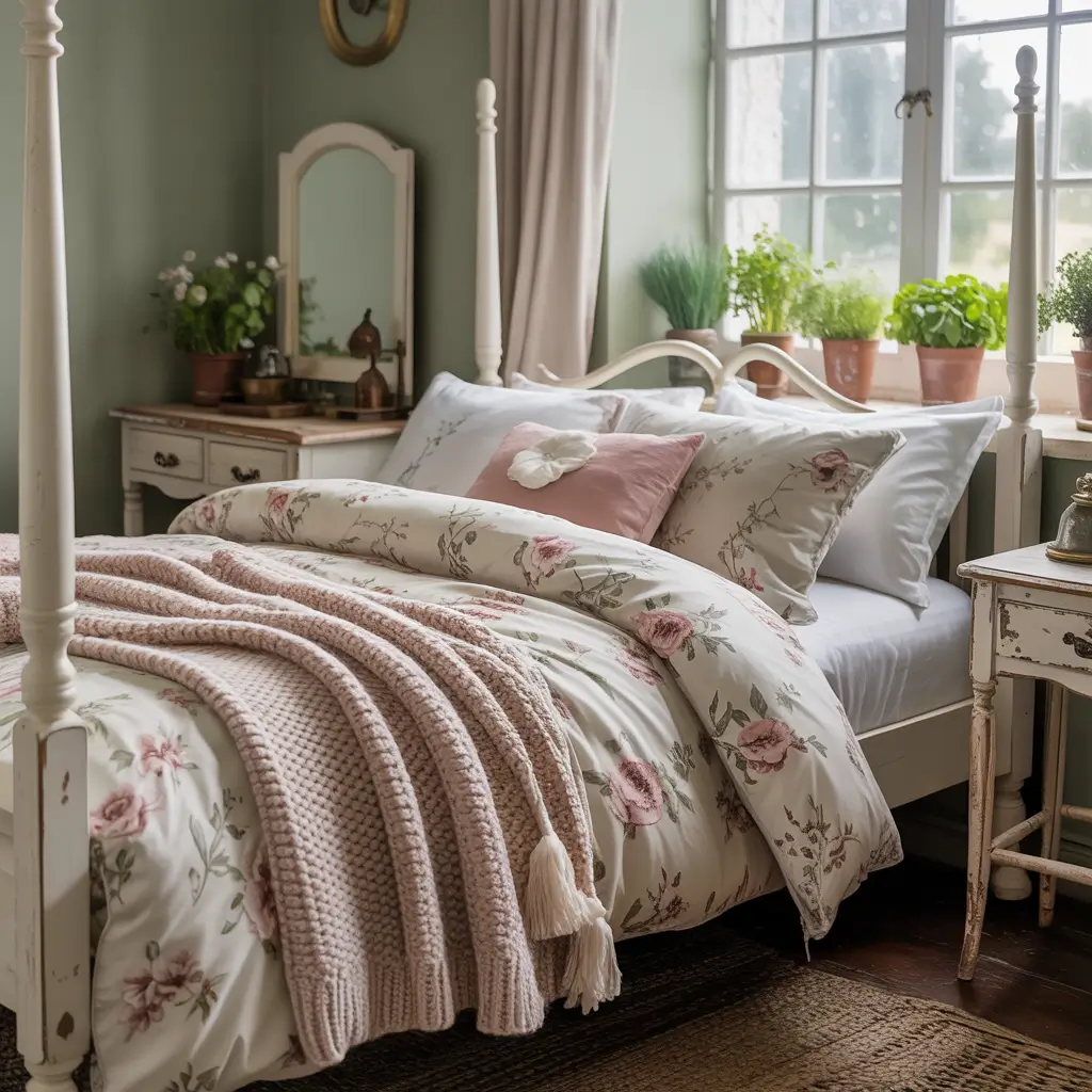 My weekend cottage bedroom features misty green walls, vintage floral bedding, and enough charm to make you want to write poetry. Or at least take a really good nap.