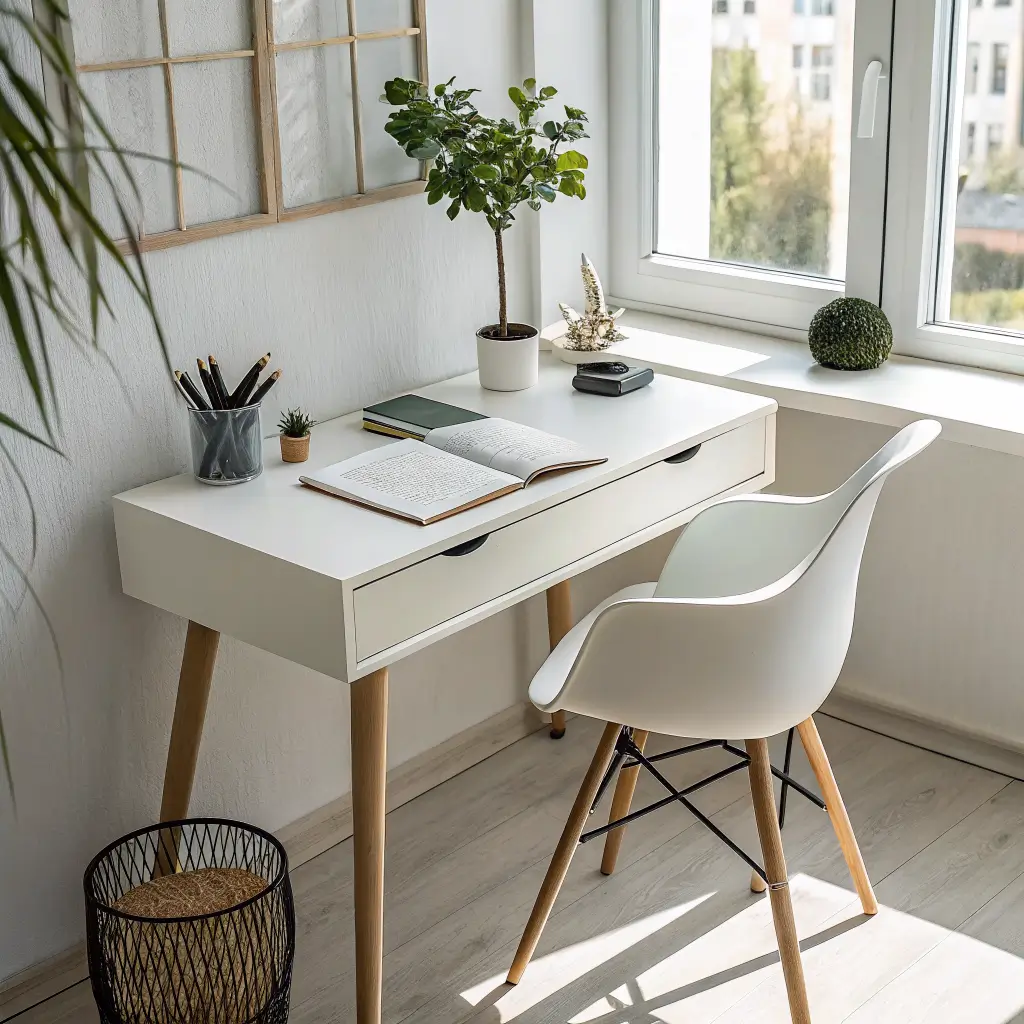 The beauty of a white minimalist setup lies in its simplicity. Start with a clean white desk (IKEA’s LINNMON is perfect and won’t cost you a fortune), add a sleek white desk lamp, and keep only the essentials visible. Your laptop, one notebook, and maybe a single plant – that’s it.