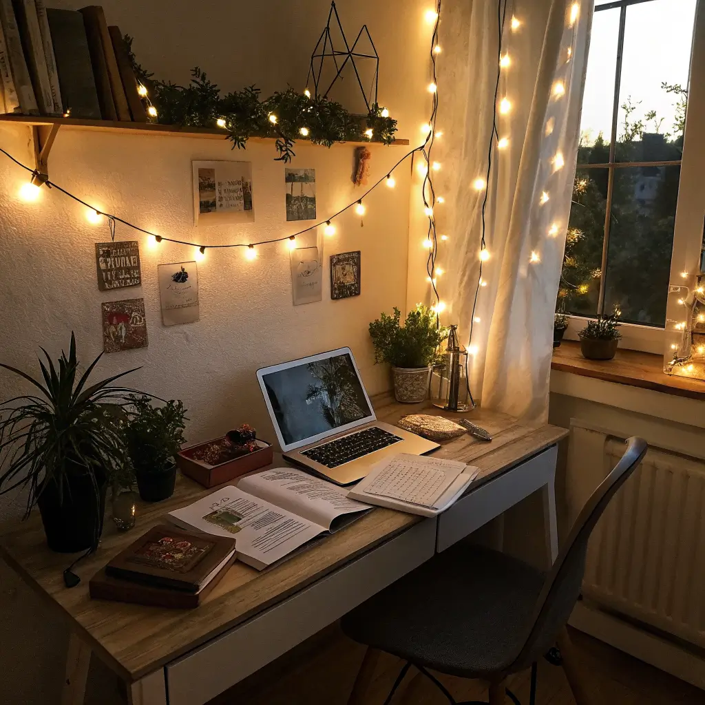 I love using fairy lights as accent lighting – they add a cozy, almost magical quality to the space without being distracting. String them around a bulletin board, along the edge of floating shelves, or even around your monitor for a soft glow.