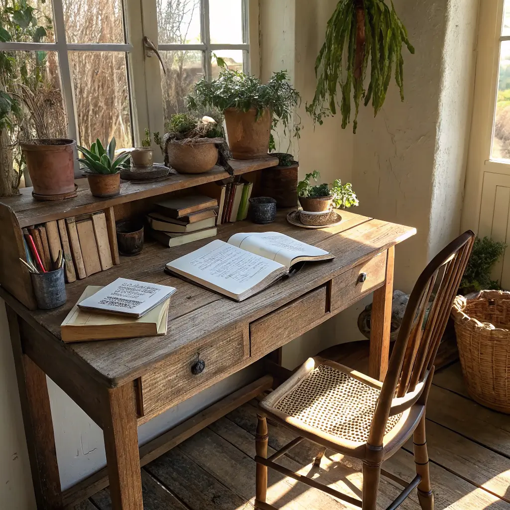 - Warm-toned desk accessories (terracotta, brass, wood)