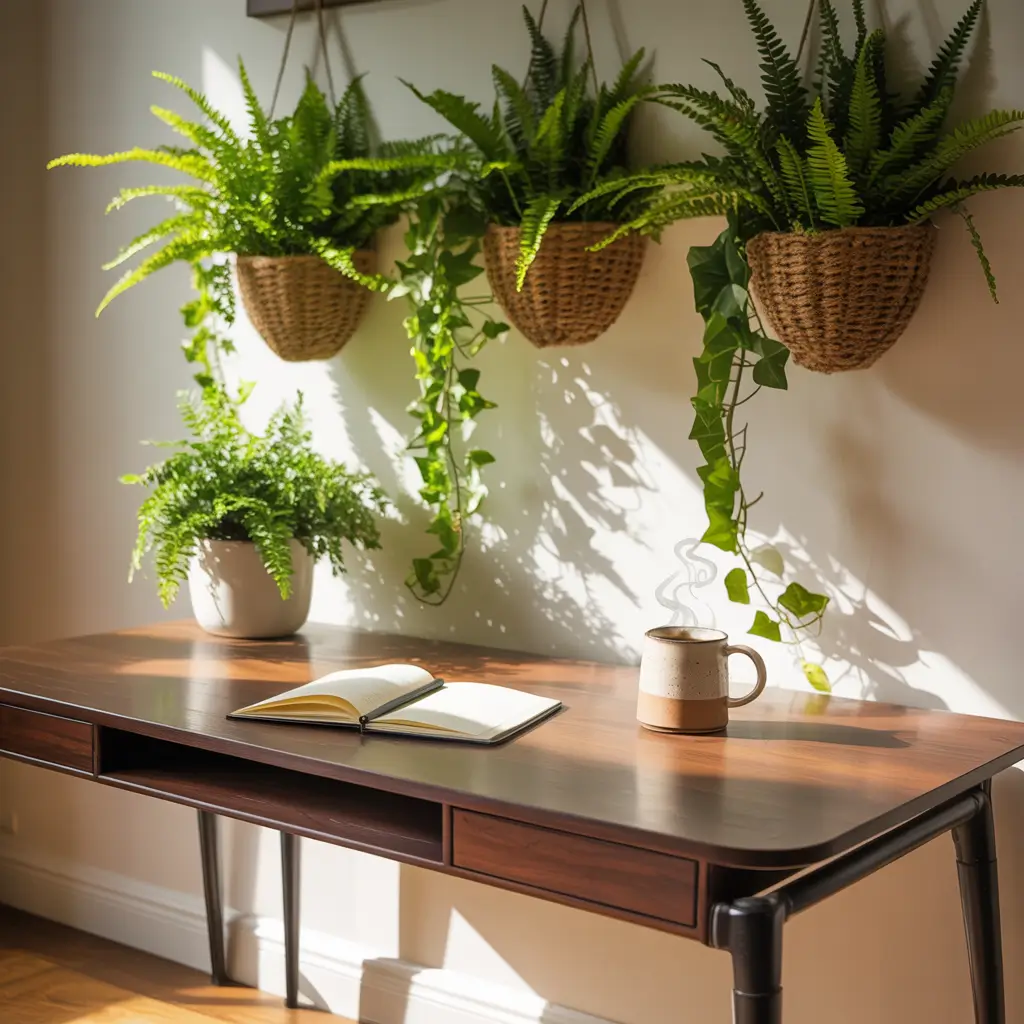 Taking your plant game vertical is a smart move when desk space is limited. Hanging planters above your workspace add life and color without cluttering your actual work surface.