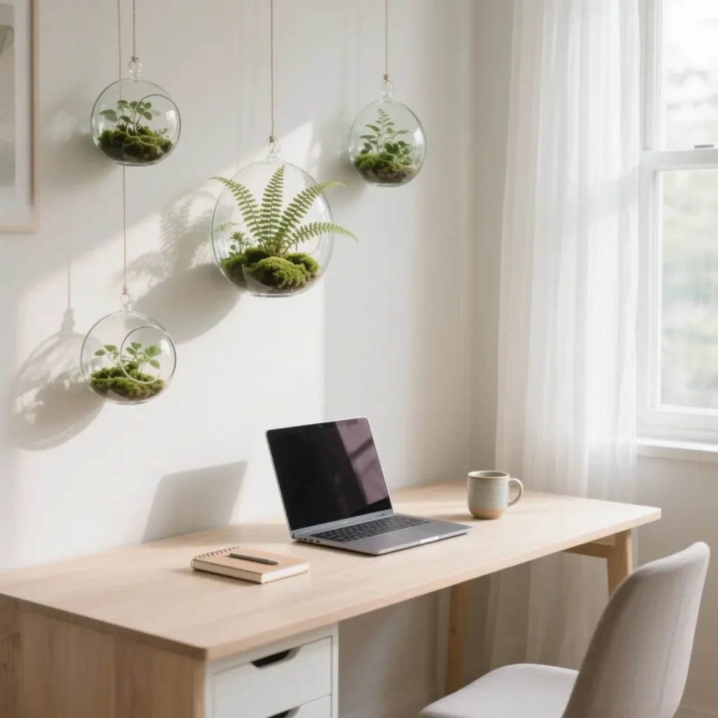Hanging terrariums bring life to your wall space without taking up any desk real estate – and they’re surprisingly low-maintenance once you get the hang of it. These little glass ecosystems add a natural element that’s both calming and visually interesting.