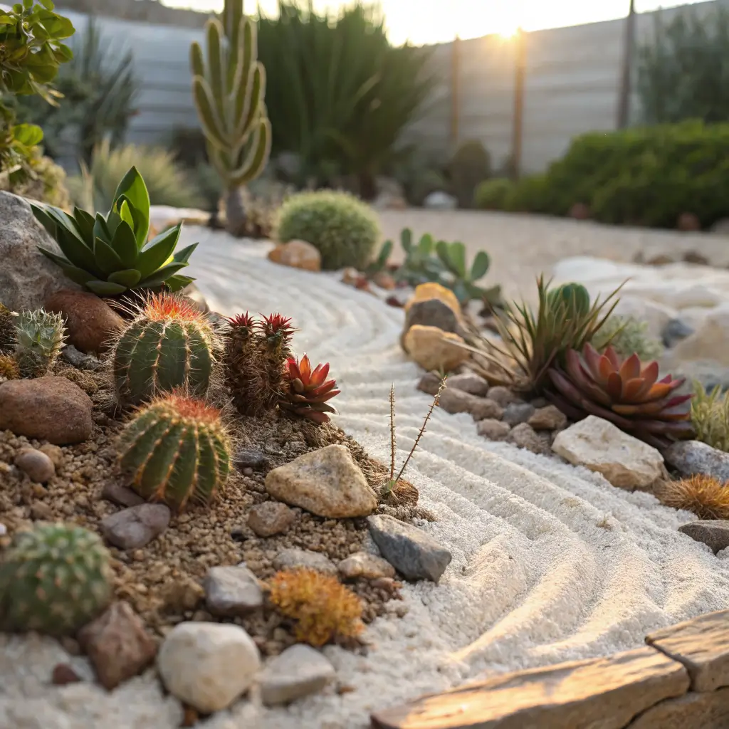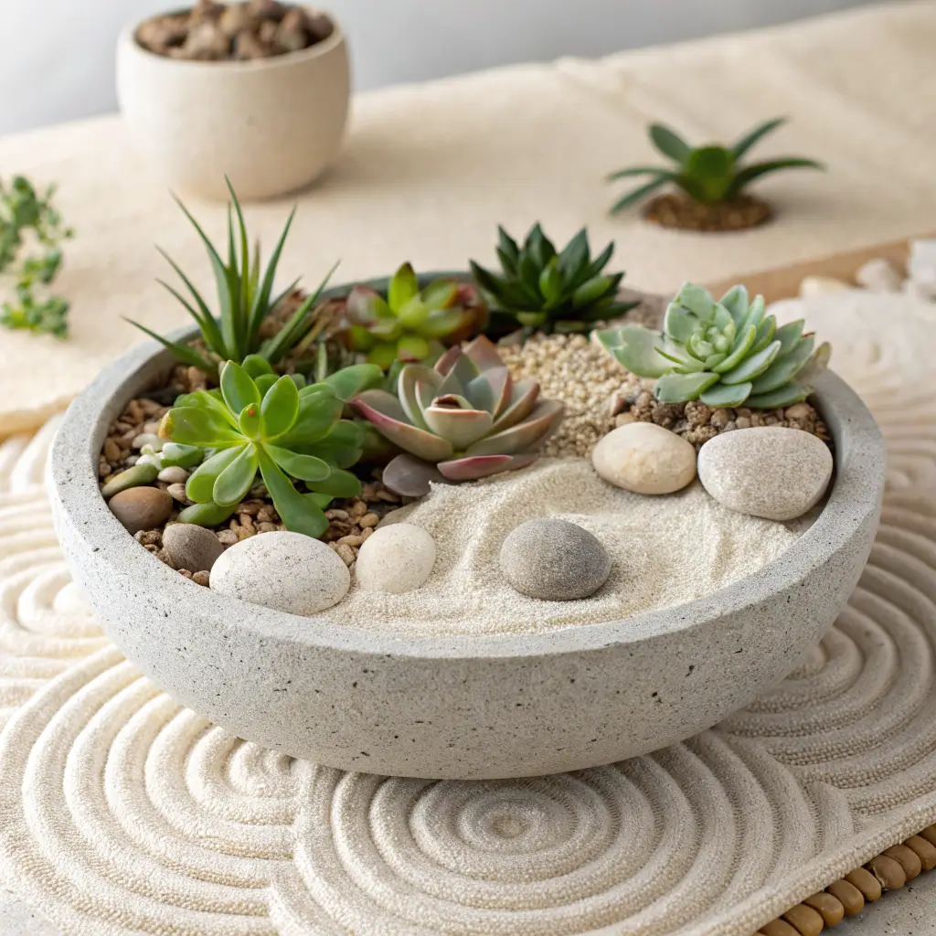 Here’s a pro tip: add some decorative elements like smooth river rocks, a small piece of driftwood, or even colored sand in subtle patterns. These hardscape elements reinforce the zen aesthetic and provide visual interest during dormant seasons.