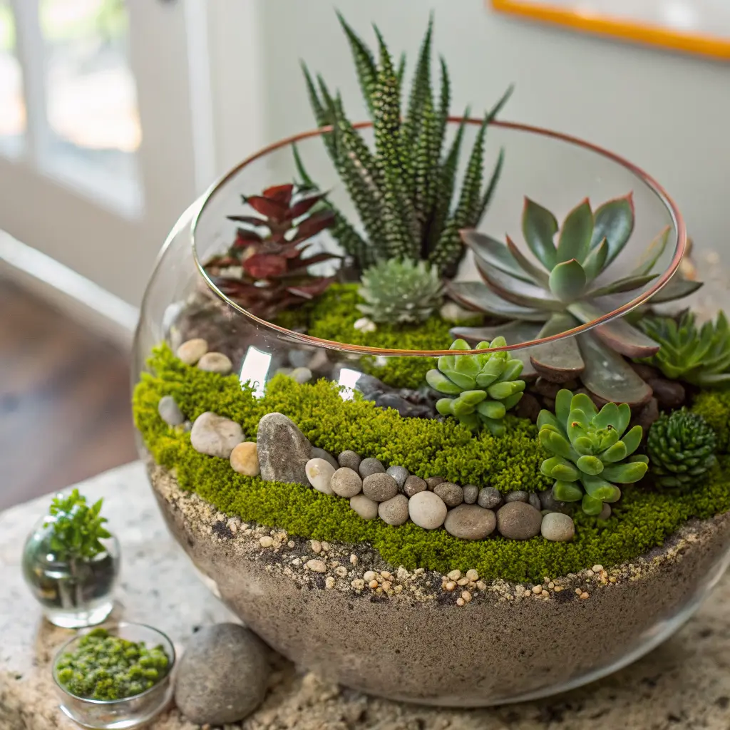 The best part about terrariums? You can create themed landscapes. Desert scenes with colored sand and small cacti, zen gardens with carefully raked patterns, or even fairy garden setups with tiny decorative elements. Just remember that less is more – overcrowding leads to poor air circulation and eventual plant loss.