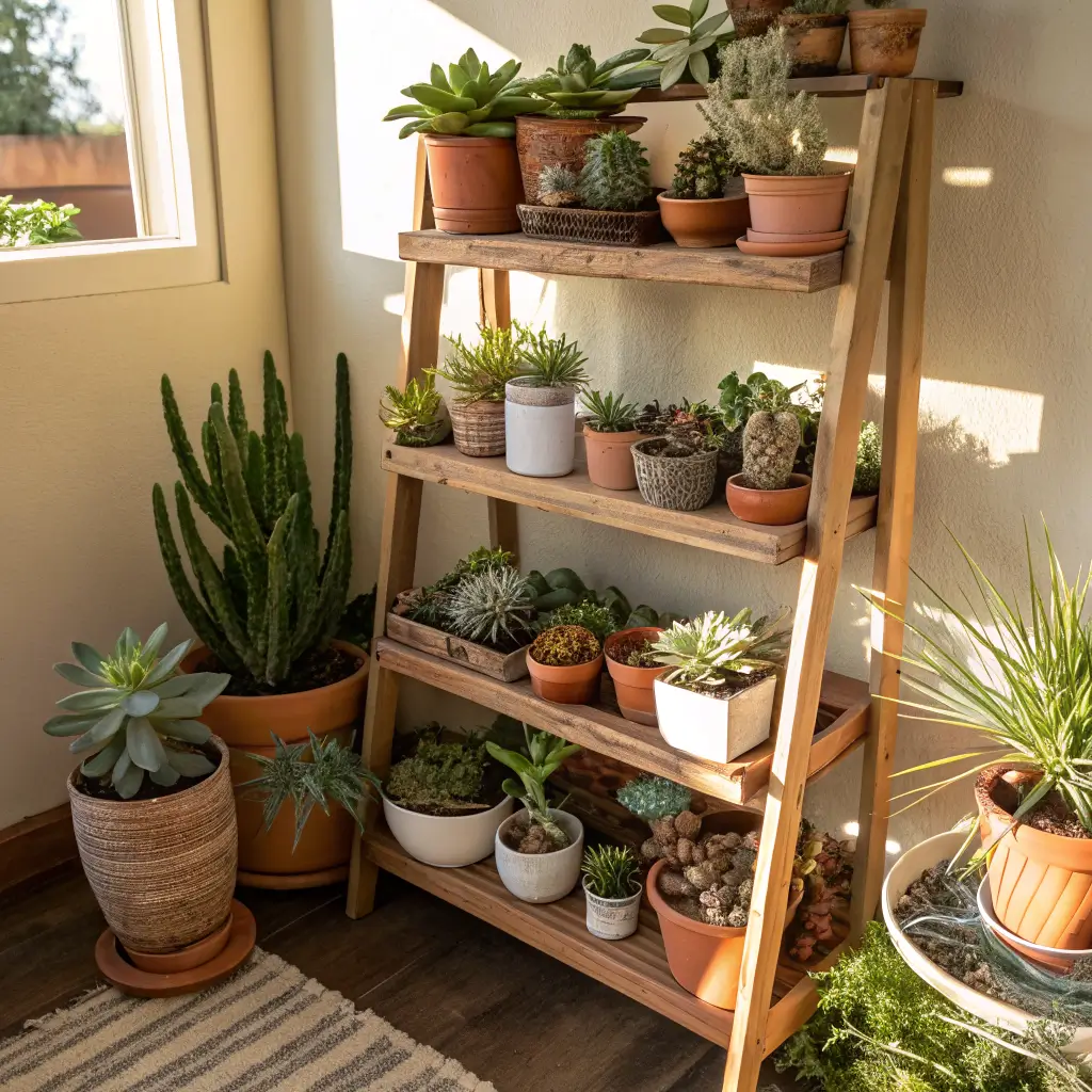 Tiered displays are like having a succulent library where every plant gets its moment to shine. The vertical organization maximizes growing space while creating this gorgeous cascading effect that works in any corner of your home or garden.