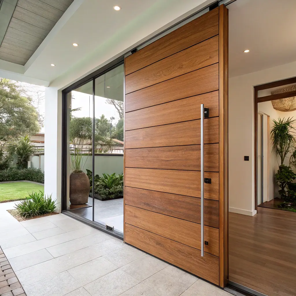 Pivot doors are having a moment, and honestly, it’s about time. Unlike traditional hinged doors that swing from the side, pivot doors rotate on a central axis, creating this dramatic sweeping motion that never gets old. Add a matte finish to teak wood, and you’ve got yourself a showstopper.