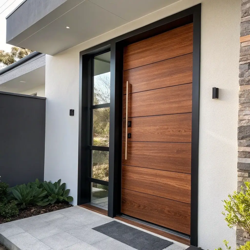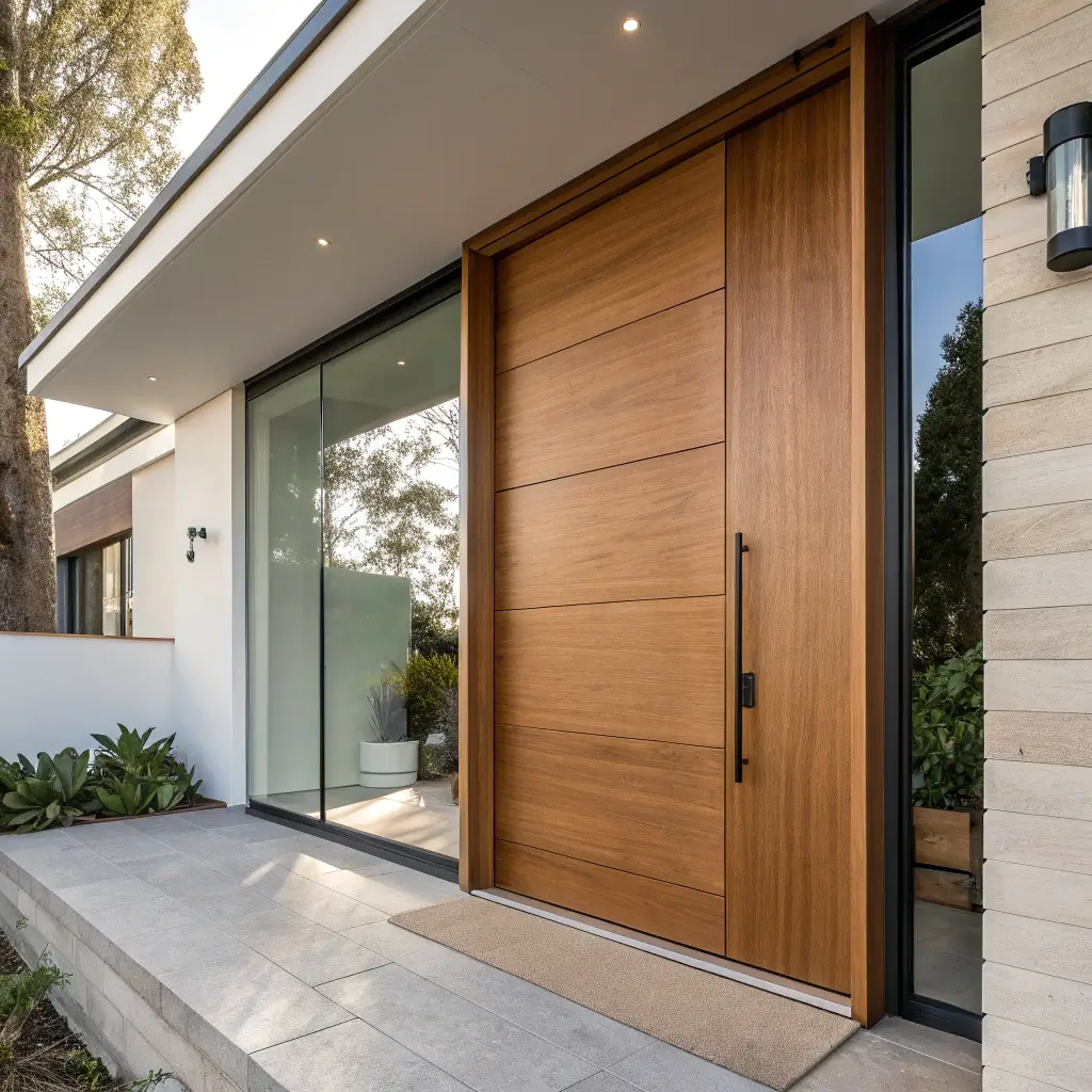 The matte finish is key here – it gives the teak this sophisticated, understated look that glossy finishes can’t match. No shine, no glare, just pure wood texture that you can’t help but touch every time you pass by. IMO, this is peak door design for contemporary homes.