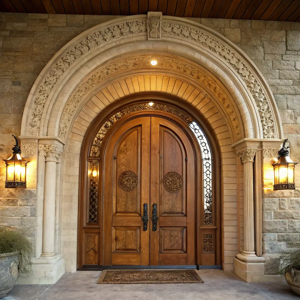 Arched doors bring this old-world charm that rectangular doors just can’t match. There’s something about that curved top that softens the entire entrance, making it feel more welcoming and less fortress-like. Teak’s natural flexibility makes it perfect for these curved designs.