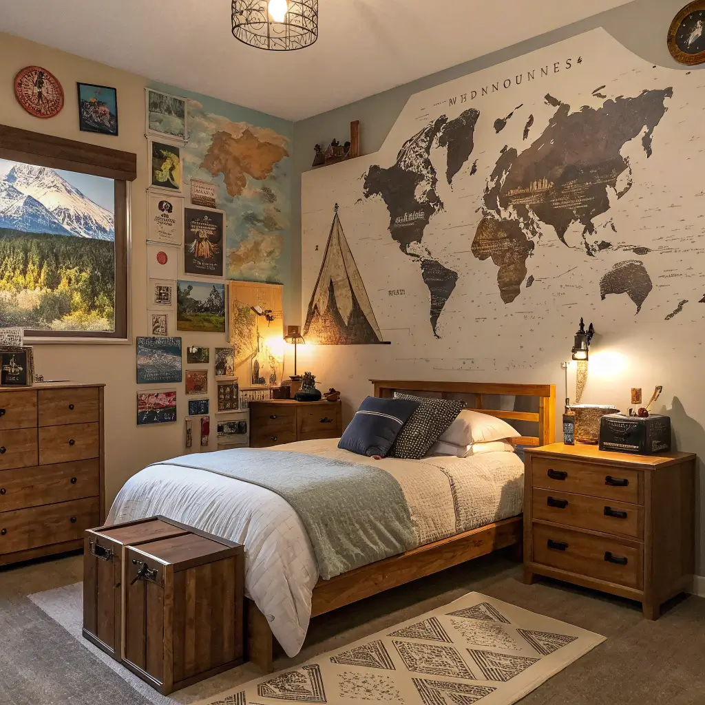 Vintage maps make incredible wall art – and I’m not talking about those cheesy educational posters. Get some authentic-looking aged maps, or even better, create a whole accent wall with map wallpaper. Add a cork board shaped like a world map where they can pin places they want to visit.