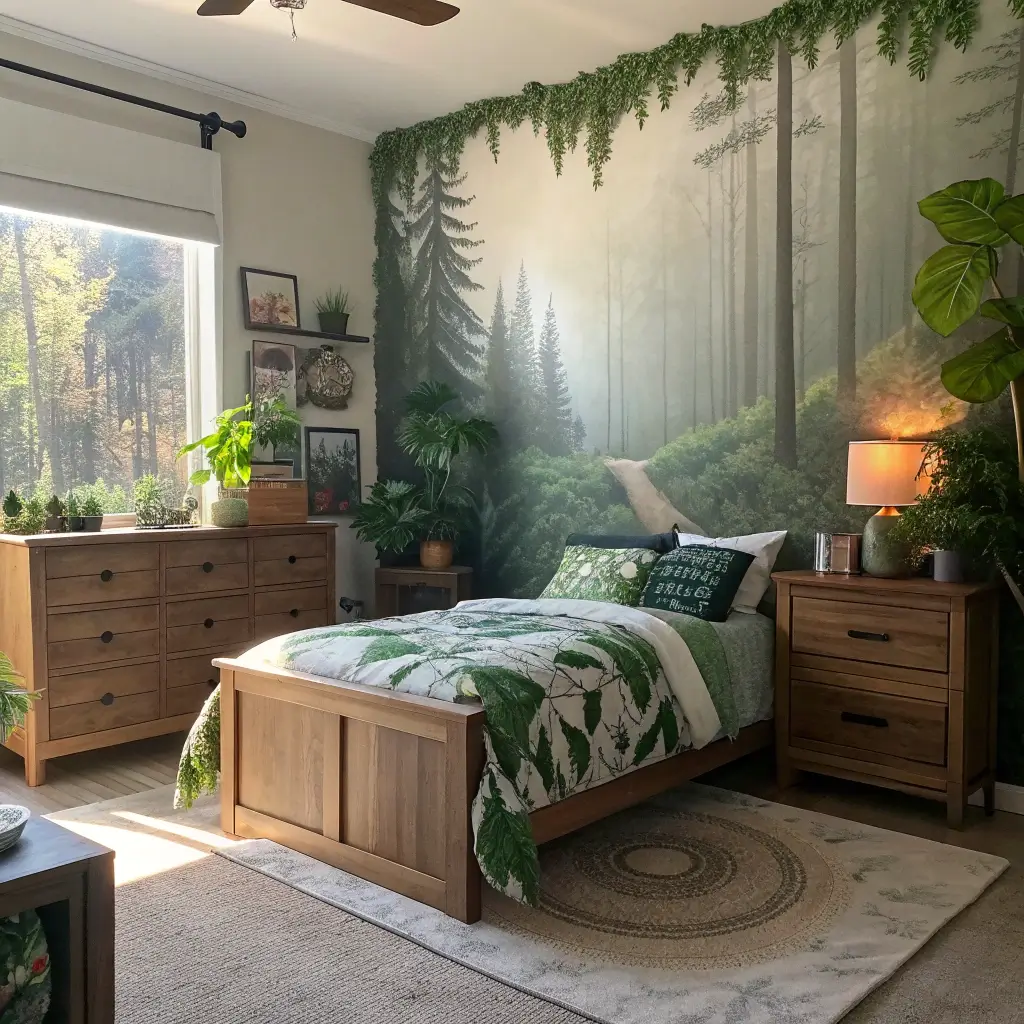 Natural materials are key here. Think wooden furniture with visible grain, jute rugs, and linen bedding. The color palette pulls from nature – forest greens, sky blues, warm browns, and stone grays.