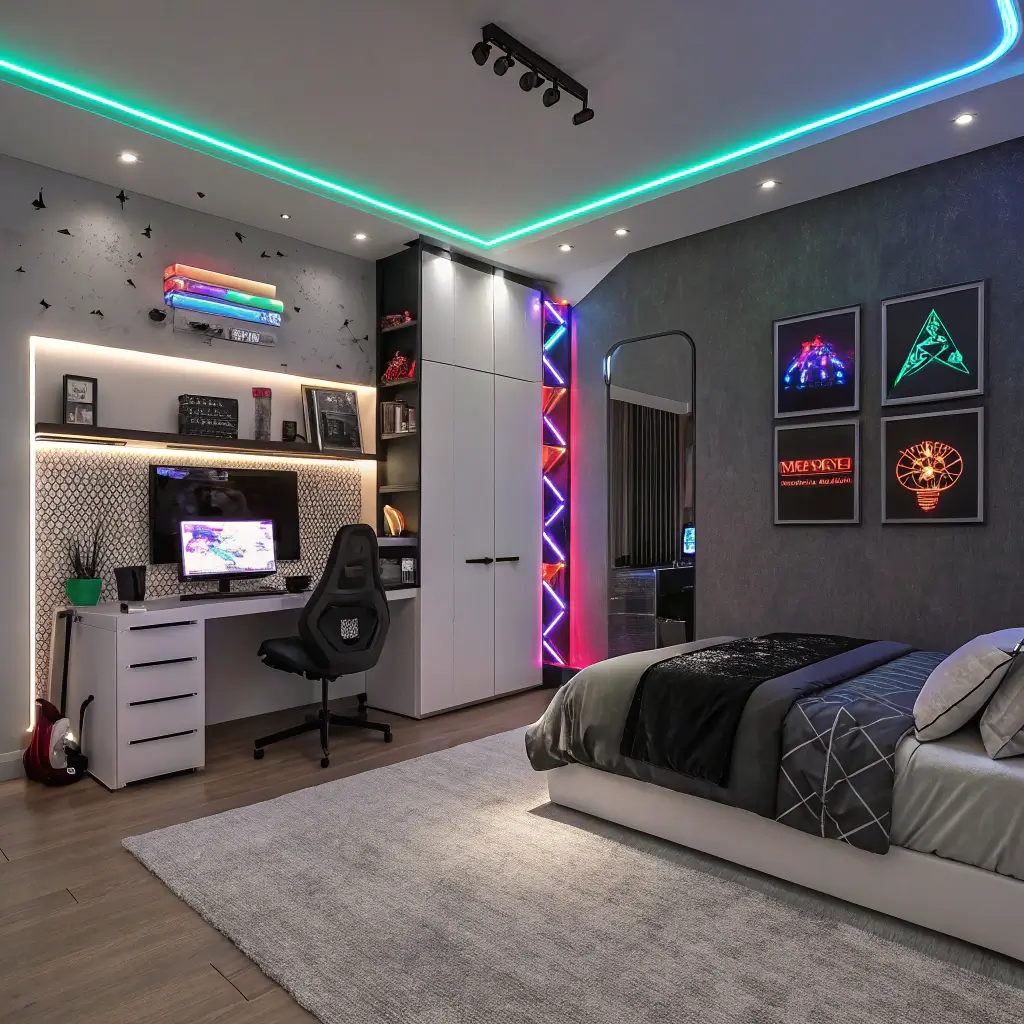 Choose furniture with clean lines and glossy finishes. White and black color schemes with neon accent colors work perfectly. Add some geometric wall decals, and you’ve created a space that feels like it’s from 2050.