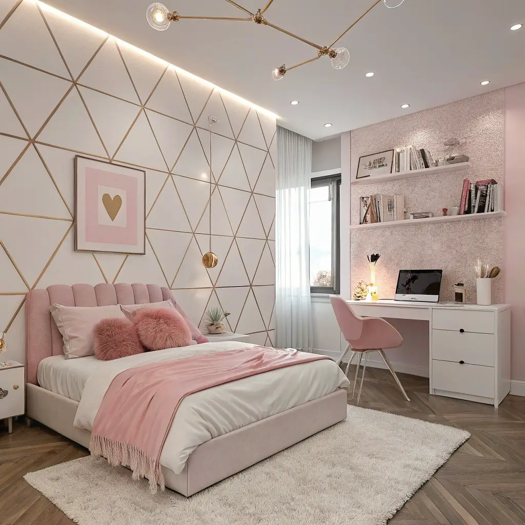 Geometric patterns keep things modern and fresh. Think chevron pillows, hexagonal shelves, or abstract art prints. Mix metallics like rose gold or copper for hardware and accessories. They bridge the gap between pink and white beautifully while adding that contemporary edge.