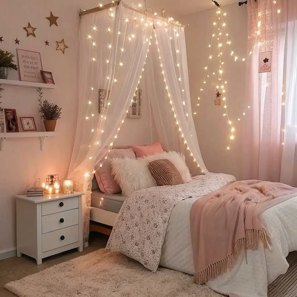 Hang lights behind sheer curtains for a soft, diffused glow. Create a canopy effect by draping them above the bed. Wrap them around mirrors, bed frames, or even inside glass jars for DIY lanterns. Pro tip: invest in lights with dimmer switches or remote controls. Nothing kills the vibe faster than having to get up to adjust your lighting.