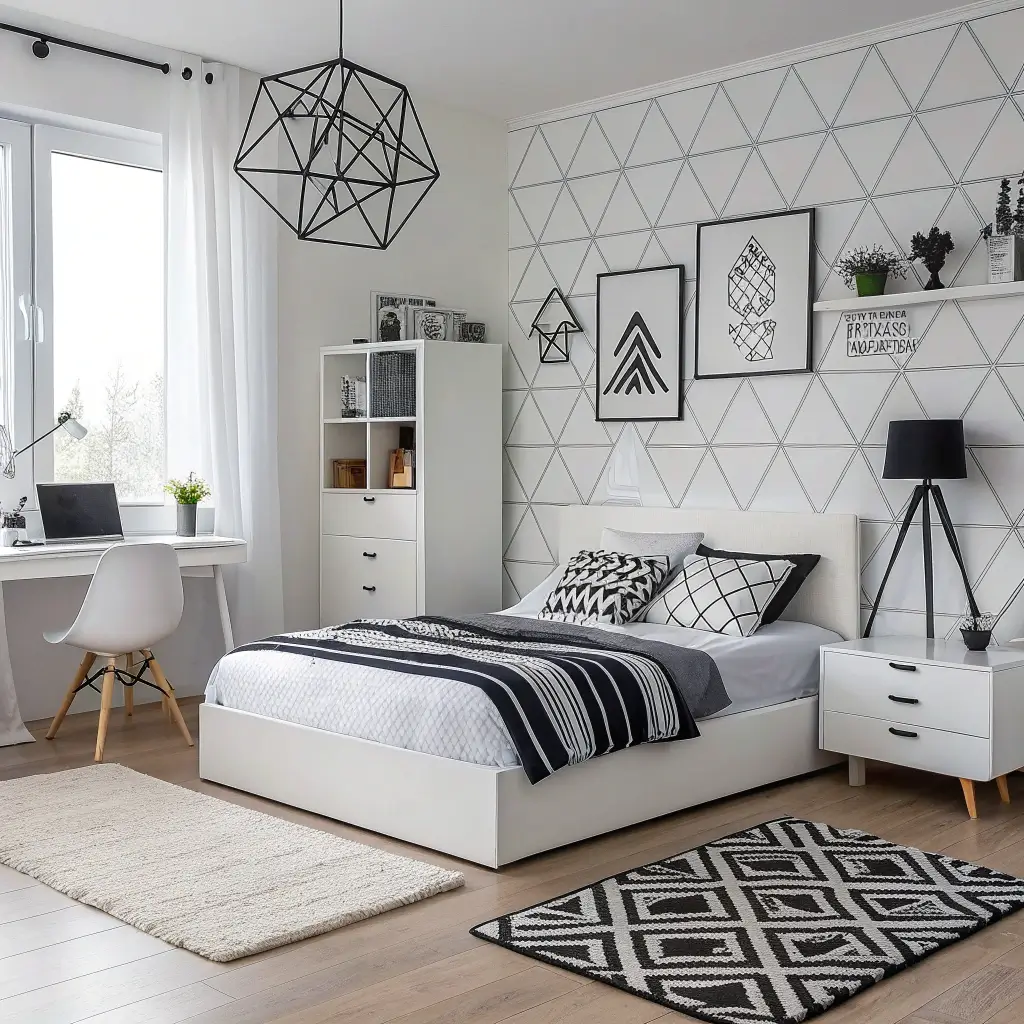 Want drama without the color commitment? A monochrome black and white bedroom delivers sophisticated edge that grows with you. This aesthetic works whether you’re into goth vibes, minimalist chic, or classic elegance – it all depends on how you style it.