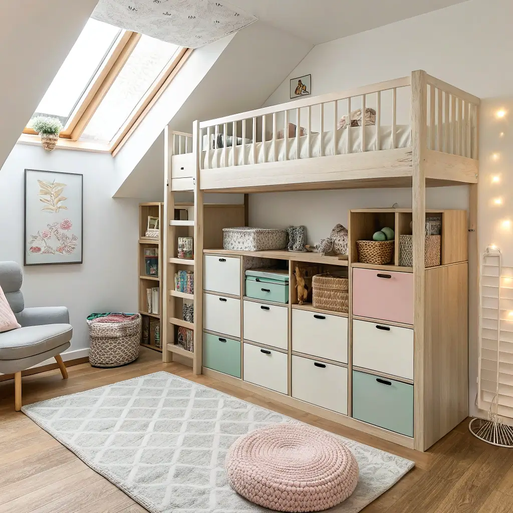 My neighbor installed a low loft system when her son turned two, and suddenly their 10×10 nursery felt massive. The bed sits about three feet off the ground, with a cozy play cave underneath complete with cushions and soft lighting. During the day, it’s a reading nook. At night, it stores all those bulky toys that usually eat up floor space.