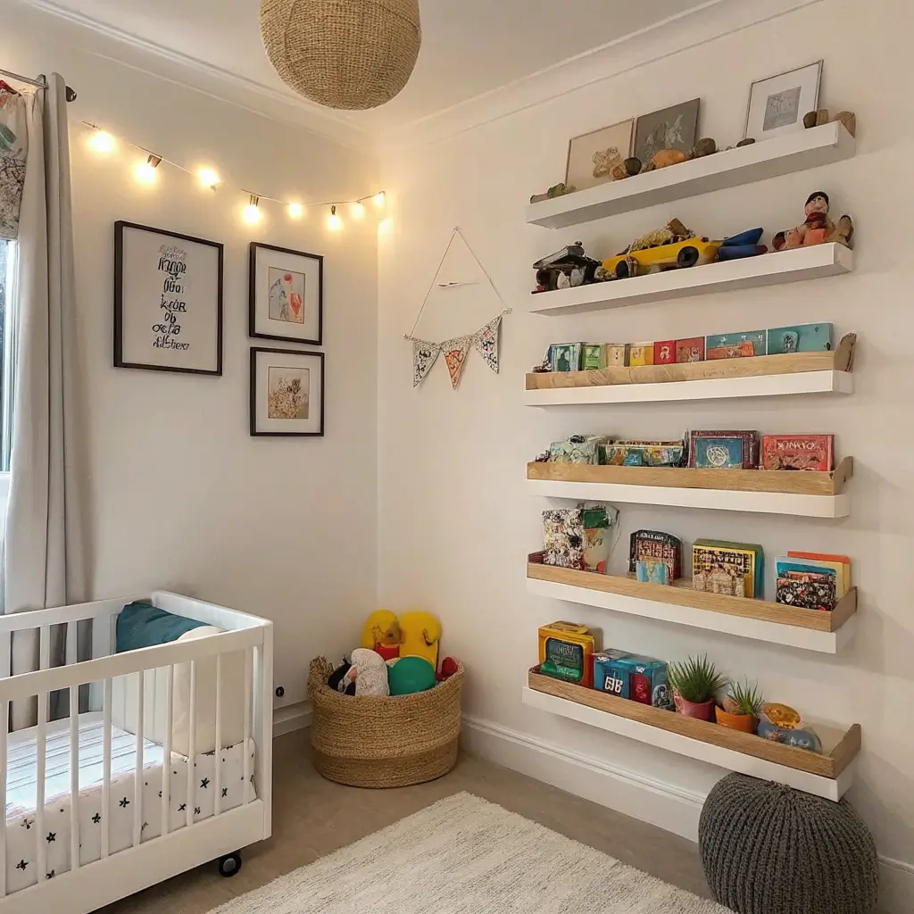 Floating shelves at different heights create visual interest while providing storage. Install them in unused corners, above the changing area, or alongside the crib. I like to style them with a mix of books, toys, and decorative objects – functional but beautiful.