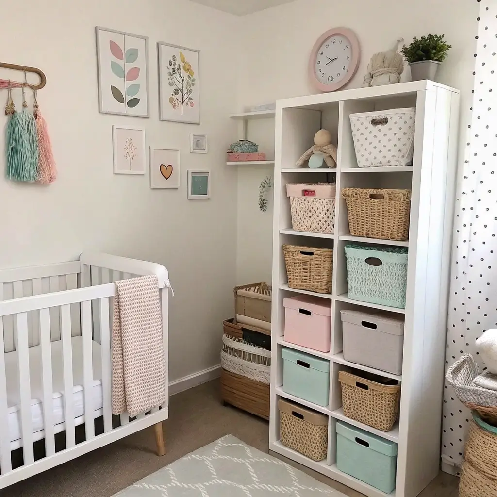 Here’s a pro move: corner shelving units. That dead corner space? Transform it into a five-tier storage solution. Corner shelves take up virtually no floor space but hold everything from diapers to stuffed animals.