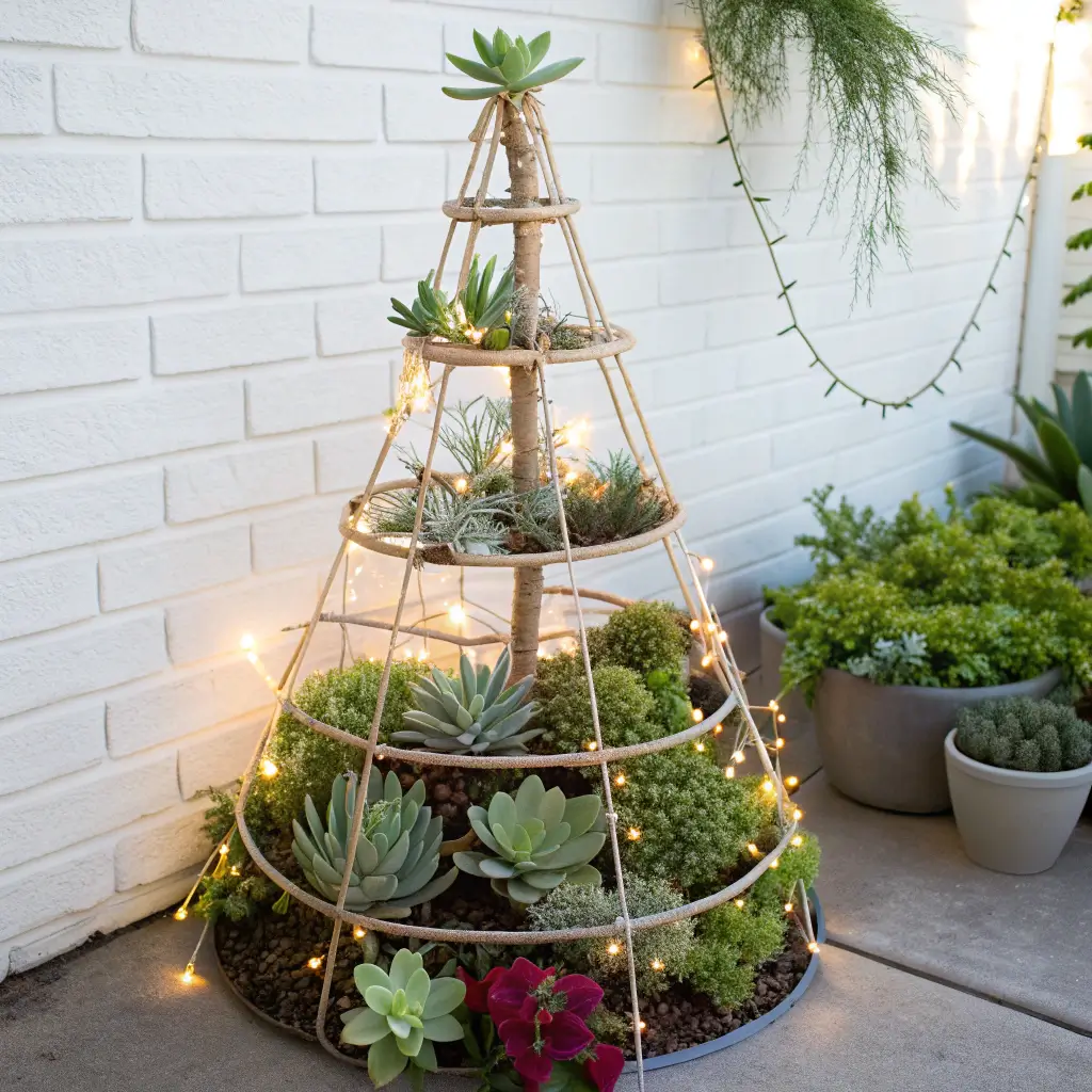 This living Christmas tree idea came to me when I couldn’t bear to pack away my succulent collection for the winter. I attached small succulent cuttings to a moss-covered tomato cage, creating a living sculpture that doubles as holiday décor.