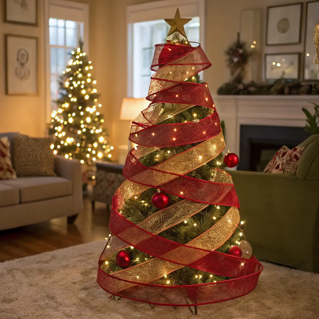 Sometimes you just want COLOR, and that’s where the ribbon-wrapped tree shines. This style lets you match any décor scheme perfectly while using up that massive ribbon collection you’ve been hoarding (just me?).