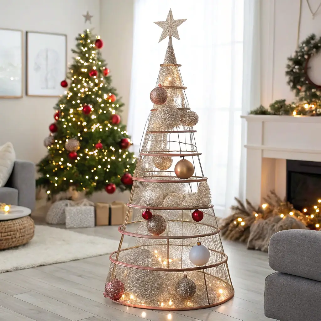 This sophisticated design makes ornaments the absolute star. Instead of hiding them among branches, you’re displaying them gallery-style on your cage frame.