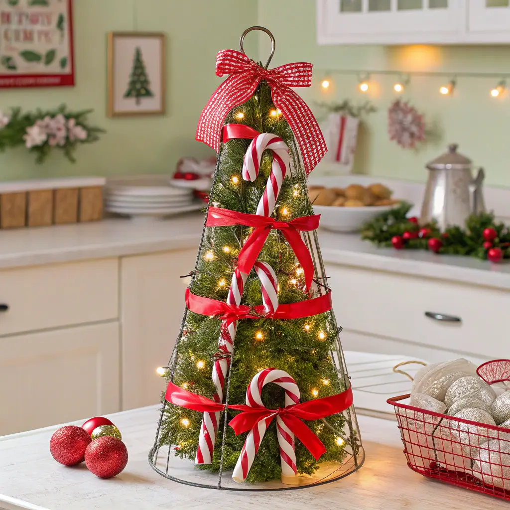 I wrap the entire cage in red and white striped ribbon to create the candy cane base, then attach actual mini candy canes all over using ornament hooks. The mix of real and faux creates a playful, whimsical tree that smells amazing thanks to the peppermint.