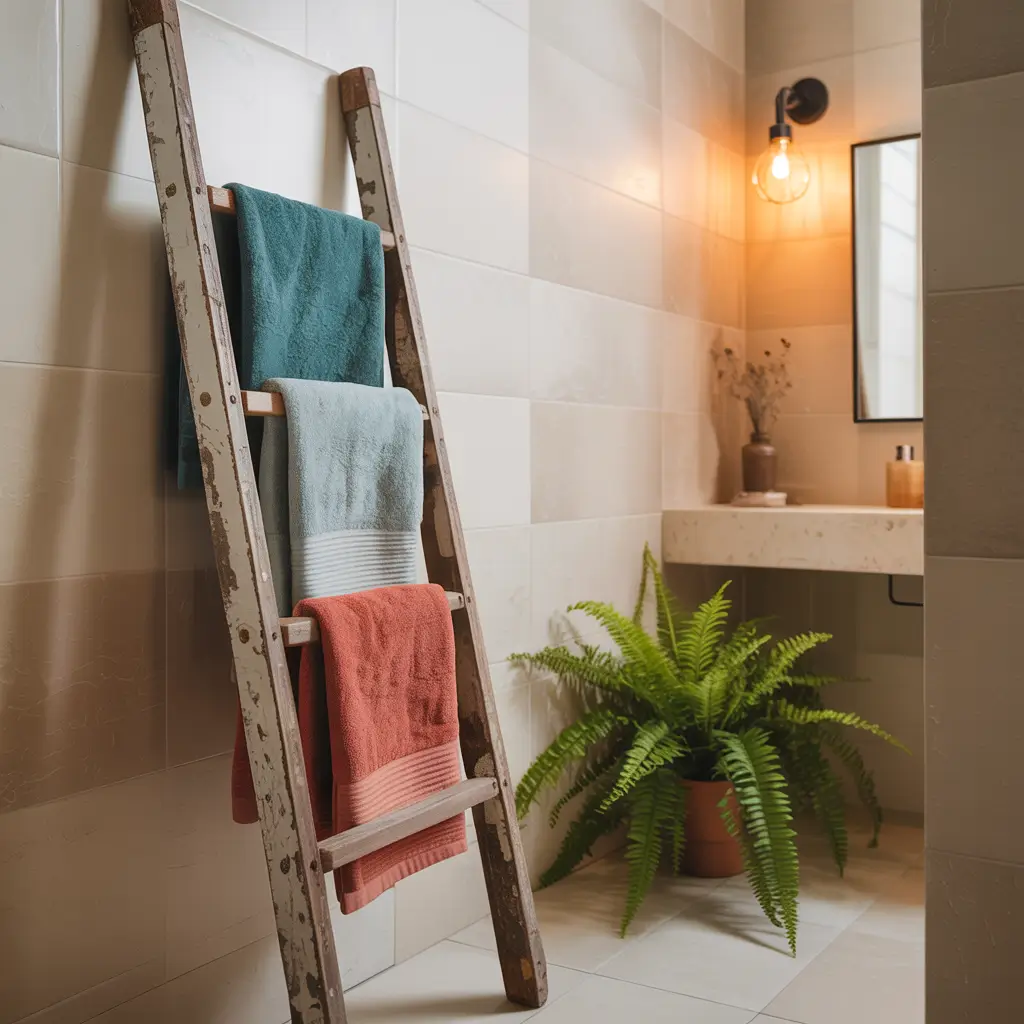 Okay, hear me out on this one. Ladder towel holders might seem like they belong in a farmhouse Pinterest board, but they’re actually incredibly practical for small spaces. Think about it – vertical storage that leans against the wall, taking up minimal floor space while giving you multiple rungs for towel storage.
