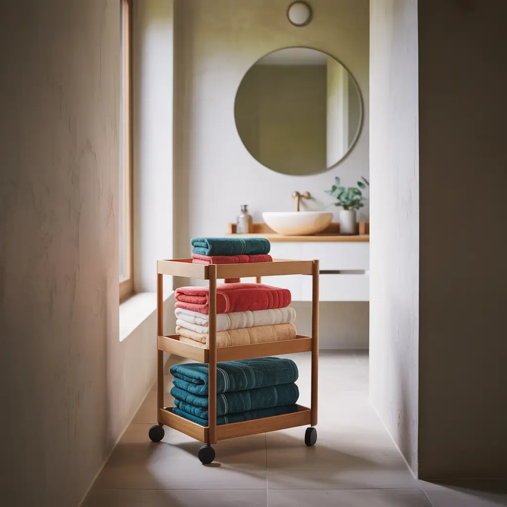 Metal mesh carts are ideal because they promote airflow, but wooden ones add that spa aesthetic if that’s your thing. Just make sure to get one with locking wheels – nothing ruins a relaxing bath like your towel cart going rogue.