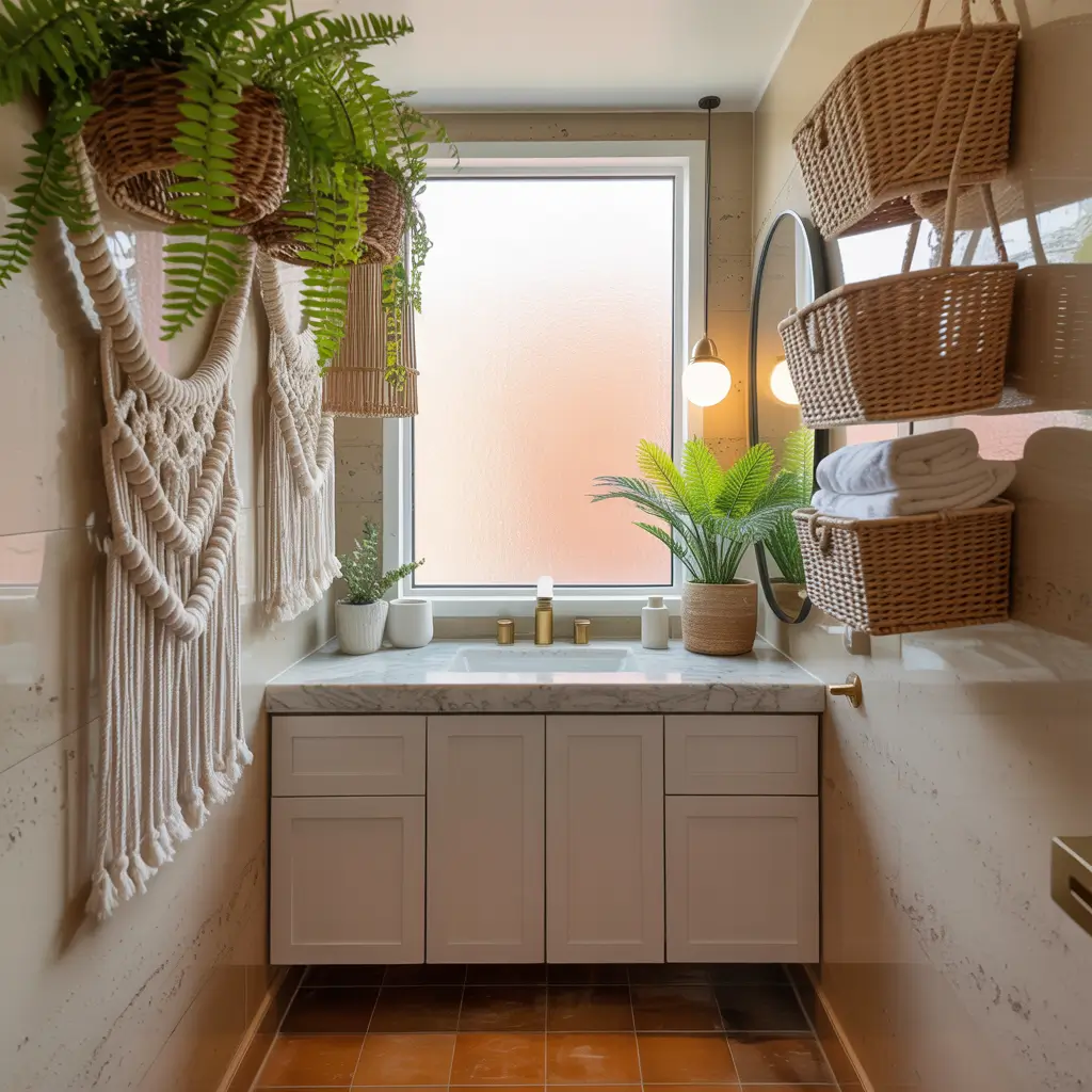 Want something different that actually works? Woven hammocks or macramé storage bring boho vibes while being surprisingly practical for towel storage.