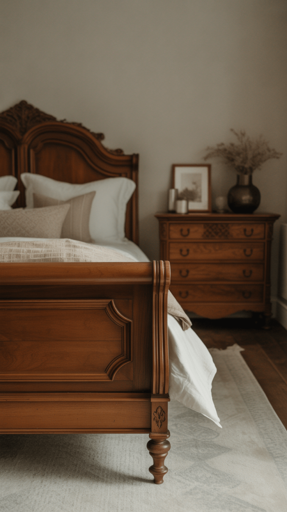 Think rich, warm tones like cherry, mahogany, walnut, or oak. The goal is to find furniture that feels substantial and well-made. Look for details like dovetail joints, carved moldings, and turned legs. A classic sleigh bed or an upholstered bed with a detailed wooden frame is an absolute winner.