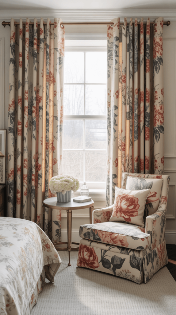 - Start Small: If you’re nervous, incorporate florals through throw pillows, a small upholstered bench, or even your curtain fabric.