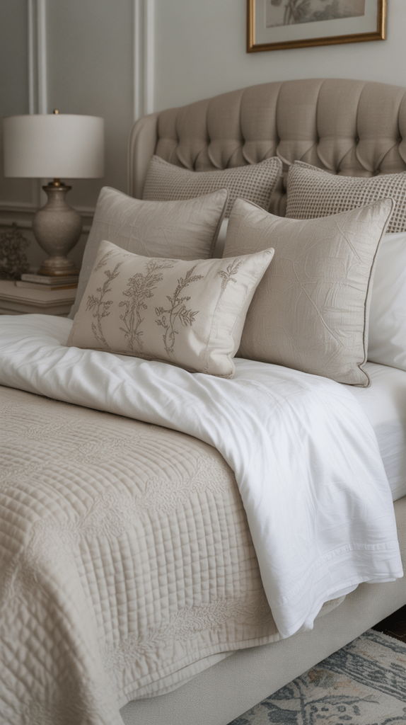 - A Statement Headboard: Whether it’s upholstered in a neutral fabric or made of carved wood, a strong headboard anchors the entire space.