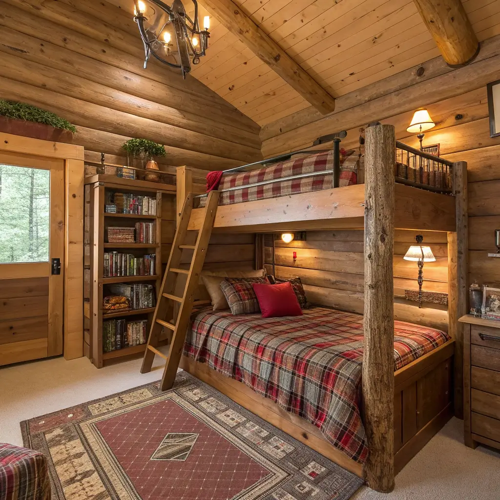 Want your boys to feel like they’re at summer camp year-round? The rustic cabin aesthetic creates that cozy, adventurous vibe while being surprisingly practical for shared spaces. Think exposed wood beams (real or faux), plaid bedding, and nature-inspired elements.