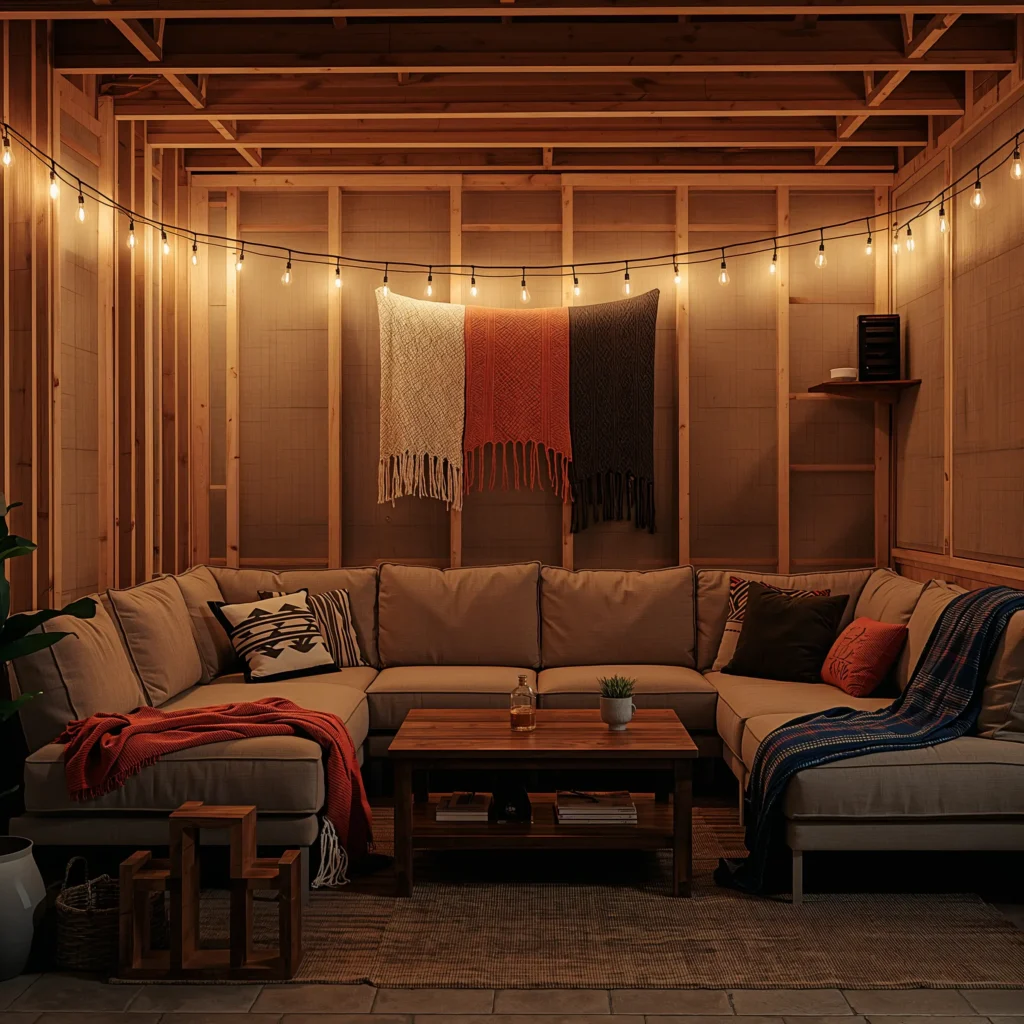 Lighting makes or breaks a basement lounge. Since you’re probably dealing with minimal natural light, string lights are your new best friend. Hang them along the ceiling beams or create a canopy effect – instant ambiance for under $30.
