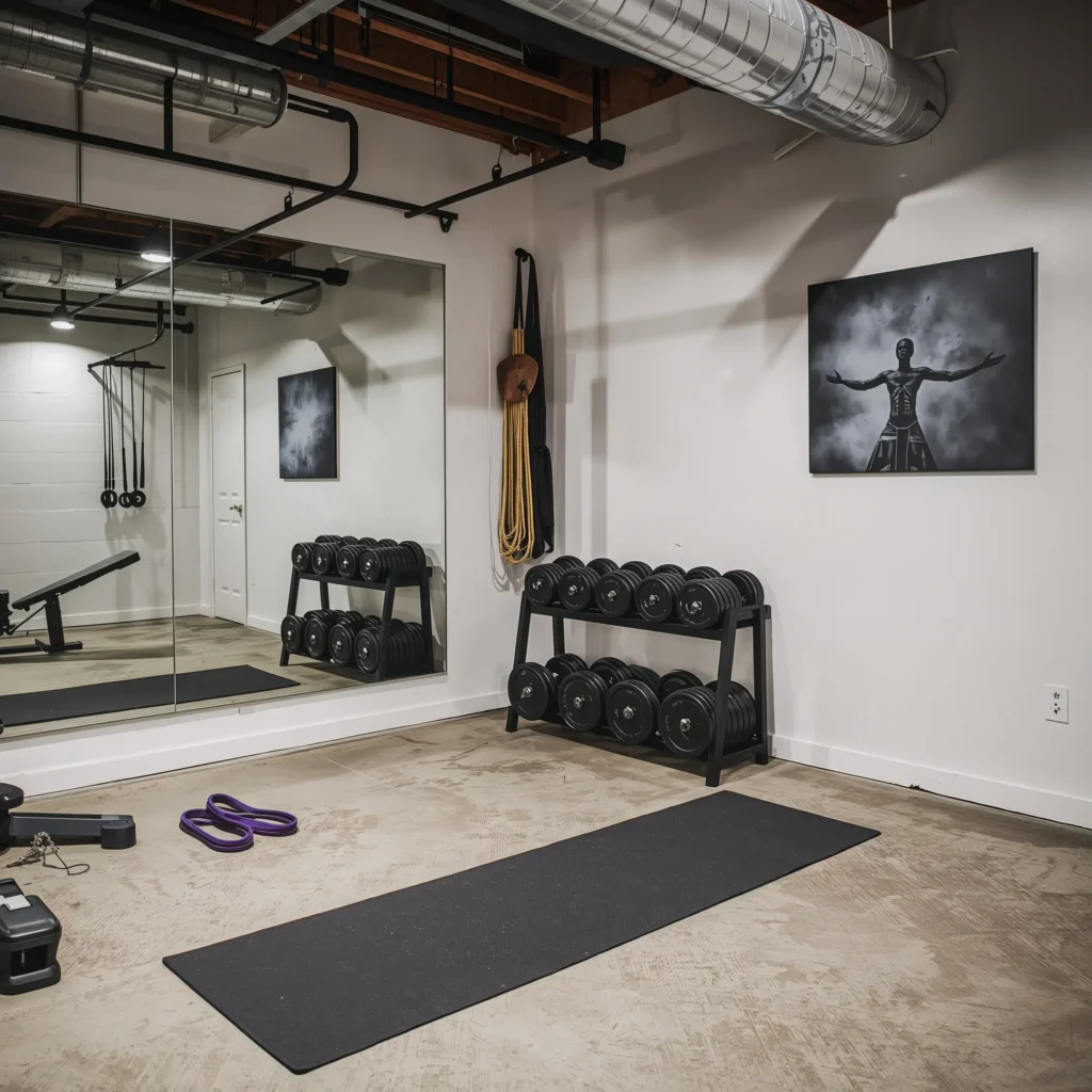 Wall-mounted equipment maximizes every square foot. A pull-up bar that attaches to ceiling joists costs about $40 and takes up zero floor space. Resistance band anchors turn any wall into a cable machine for $15.