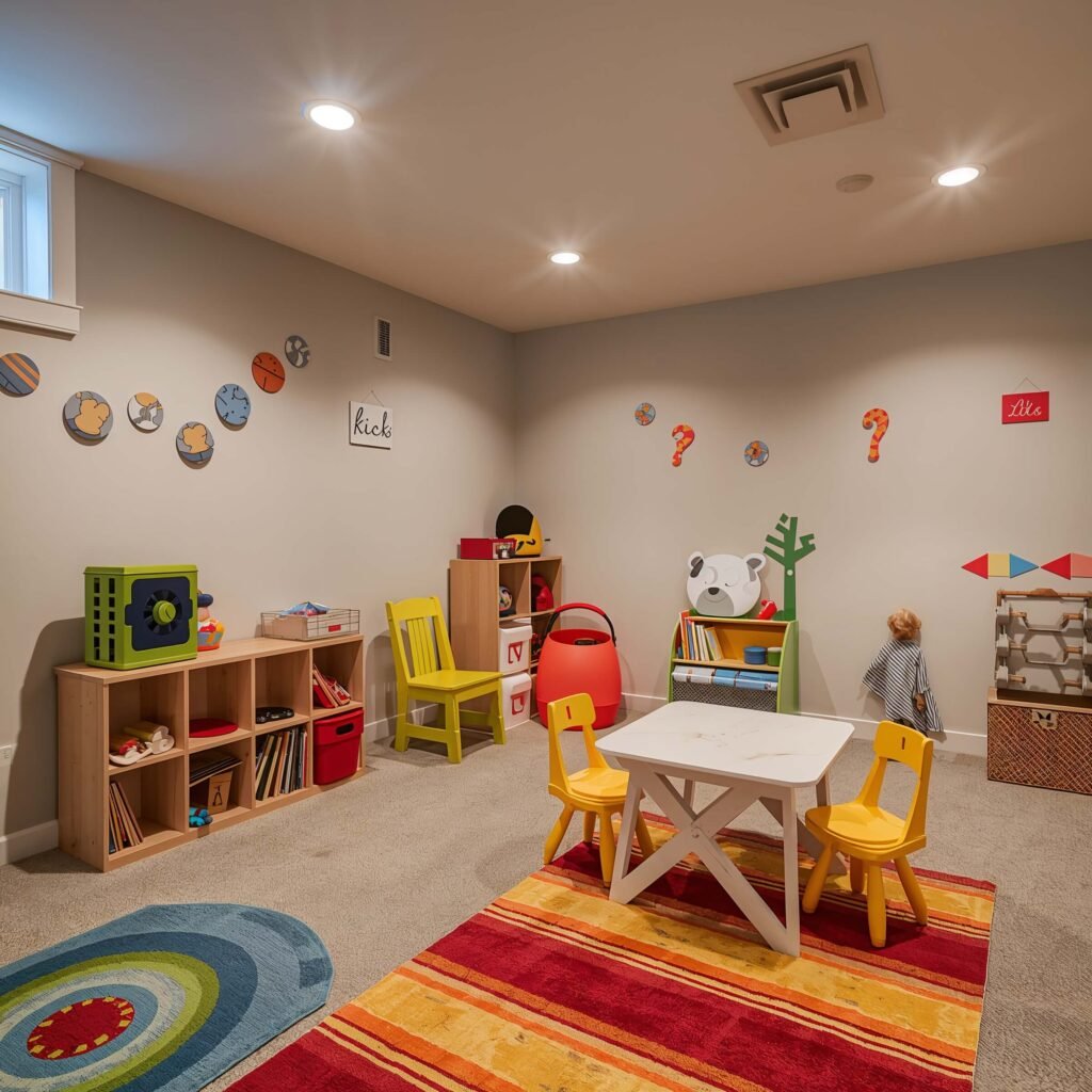 Before anything else, make sure your basement is safe for little ones. Foam corner guards cost a few dollars but prevent countless tears. Baby gates at the stairs are non-negotiable if you’ve got toddlers.