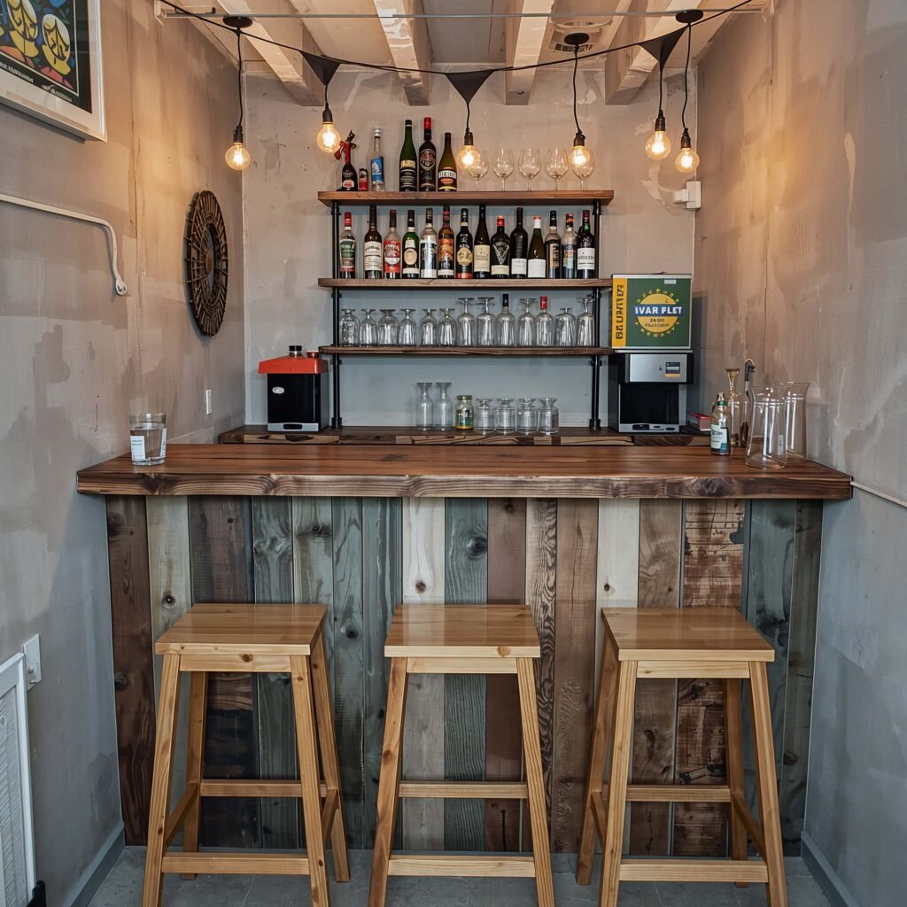 Open shelving behind the bar showcases your collection without expensive cabinetry. Floating shelves made from reclaimed wood and brackets cost about $20 per shelf and look incredibly authentic.