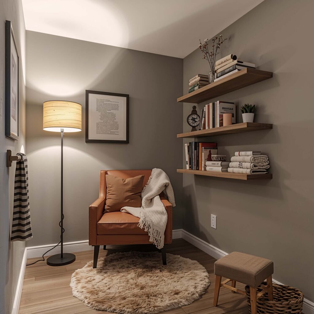 Reading requires specific lighting that won’t strain your eyes. A good floor lamp positioned behind your chair prevents shadows on your book. Adjustable pharmacy lamps ($30-40) let you direct light exactly where needed.